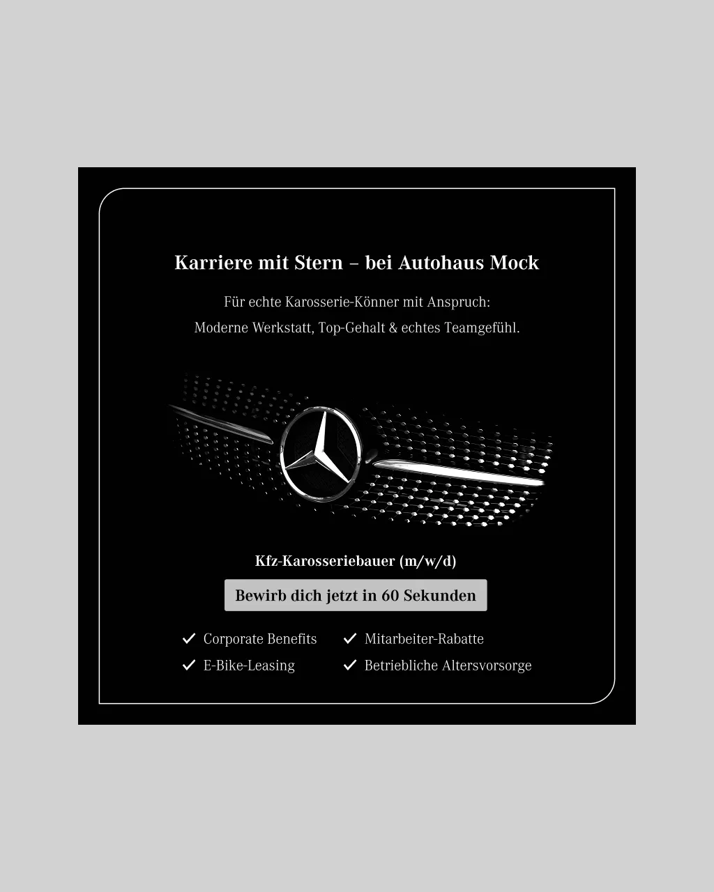 Ich entwickle Meta-Kampagnen, die Leads generieren, gestalte Recruiting-Anzeigen, die Bewerbungen bringen, und baue Markenauftritte, die professionell wirken, online wie offline. Von Performance Creatives über Messewände bis hin zu kompletten Markenidentitäten.
