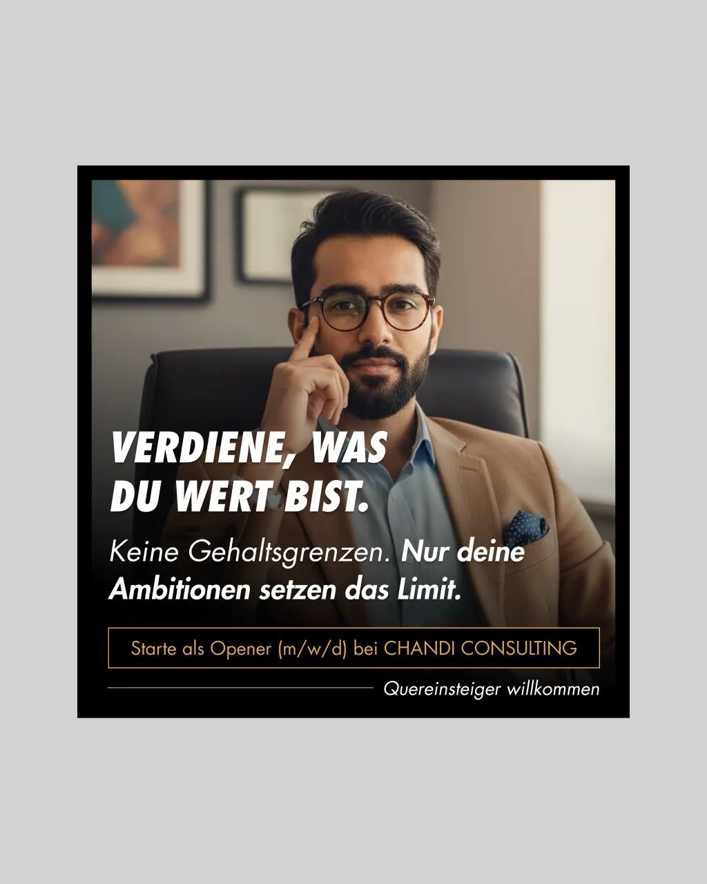Ich entwickle Performance Creatives für Marken, die sichtbar wachsen wollen, digital und im Raum. Meta Ads, Recruiting-Kampagnen, Markenauftritte und Kampagnendesign. Klar gedacht, präzise umgesetzt.
